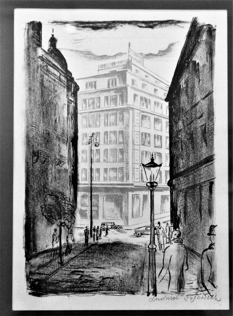 However, for many Lviv artists, living in the Sprecher skyscraper was not affordable. Even though this building was attracting many of them. This consumerist Mecca presented modernist forms and a new world for inspired painters, photographers, and philosophers. For example, the Sprecher “skyscraper” became a central figure in one of the famous lithographs of Lviv avant-garde painter and graphic artist Ludwik Tyrowicz. He was part of the Lviv avant-garde Association of Visual Artists – Artes and worked with themes of urban landscape. In 1932, he created a series of lithographs called “Beautiful Lviv” and, of course, he couldn’t omit the most prominent representative of its time – the Sprecher “skyscraper”. According to Polish researcher Jerzy S. Majewski, Tyrowicz also participated in the design process for the building’s facade[19].