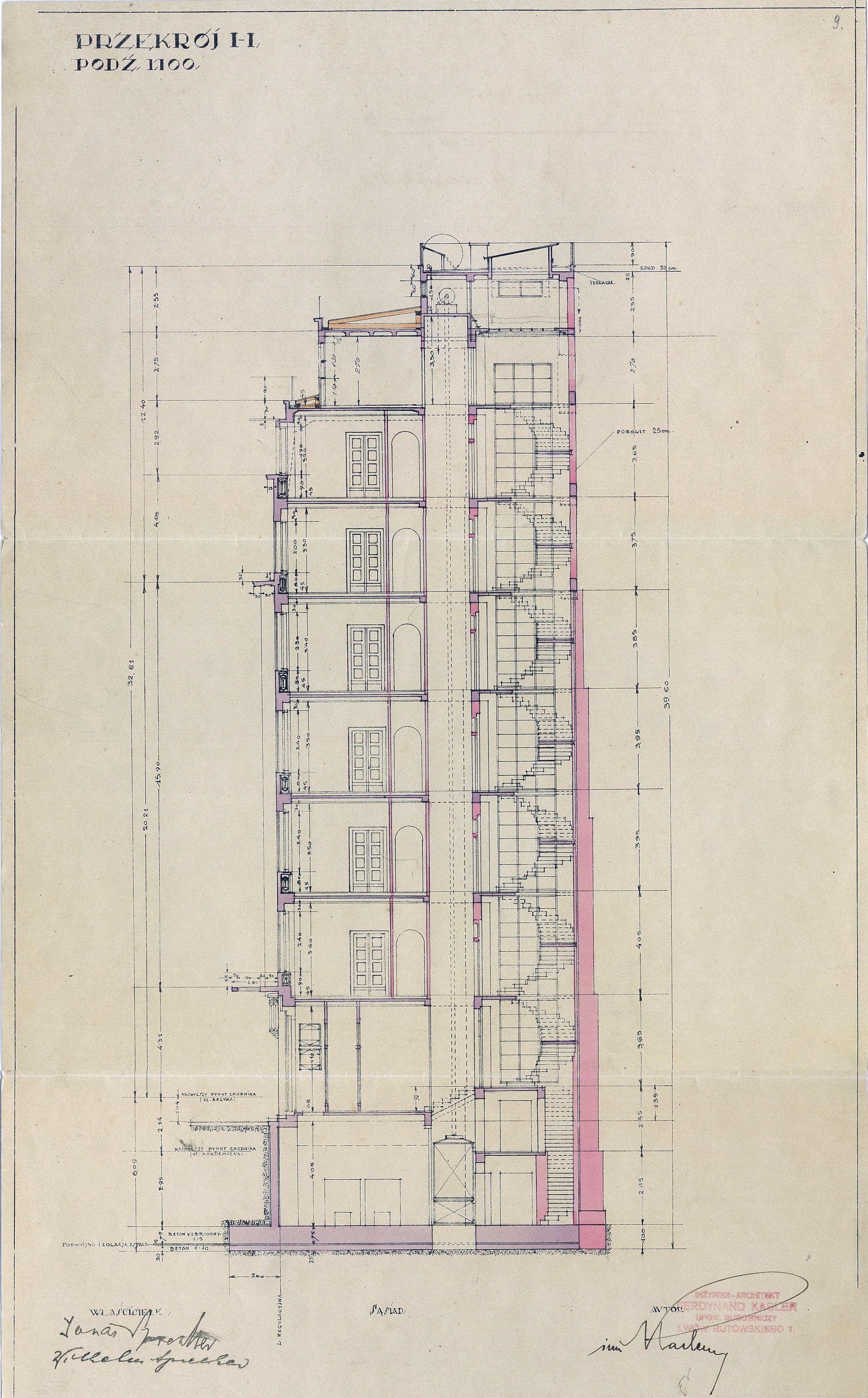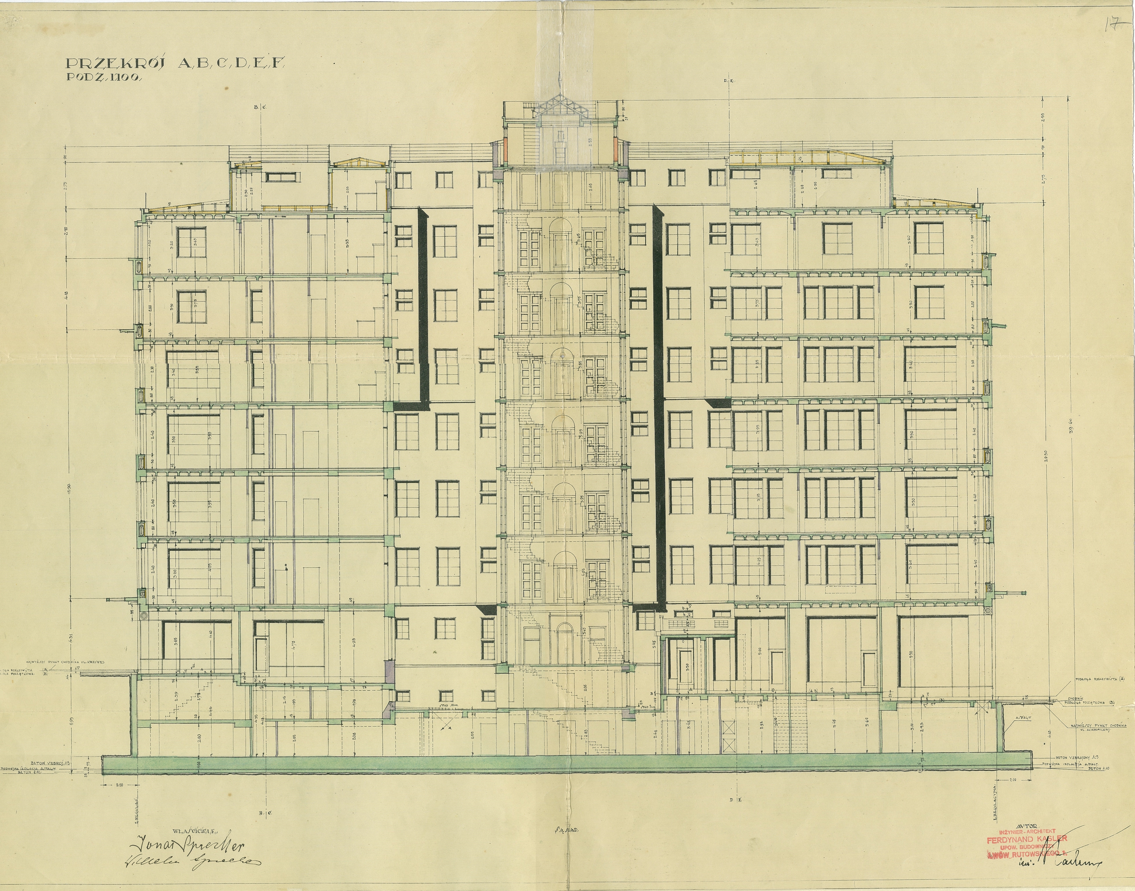 Reinforced concrete slabs between floors have a peculiar wave-like form, where the voids are filled with air, serving as an additional isolation tool. The construction of the house was shrouded in legends. Some of them were saying that Sprecher’s “skyscraper” was built on top of the river Poltva. However, the architect Ferdynand Kassler refutes this information in an interview in the local newspaper “Chwila”. The building is only partly positioned on the old riverbed, where the soil is not stable enough, said the architect[4]. That’s why the ground beneath the foundations was strengthened with a 105 cm thick reinforced concrete slab.